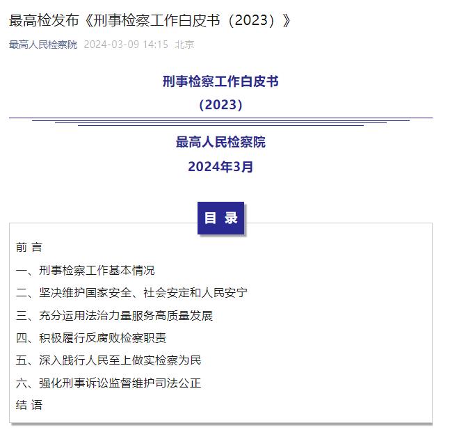 :2023年,在以习为核心的党中央坚强领导下,全国检察机关坚持以习新时代中国特色社会主义思想为指导,深入贯彻习法治思想和党的二十大精神,持续落实《中央关于加强新时代检察机关法律监督工作的意见》,忠实履行法律监督职责,高质效办好每一个案件,为大局服务、为人民司法、为法治担当,以检察工作现代化服务中国式现代化,刑事检察工作在巩固中深化、在完善中提升。