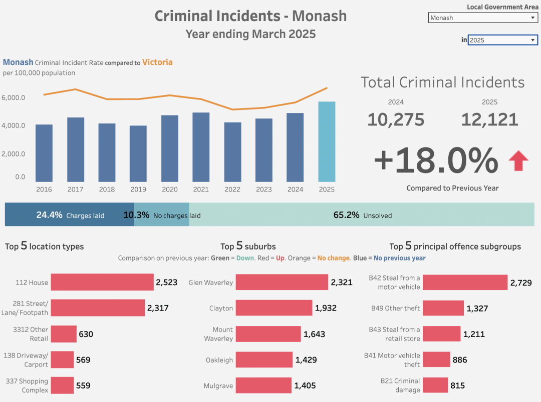 根据维州犯罪数据统计局(Crime Statistics Agency)2024年最新公布的数据,Monash地区的刑事案件总数较前年上升了4.5%,延续了自2022年以来的上升趋势。尽管相较于2023年19.8%的增幅有所放缓,但治安形势依然严峻。MCSA特别提醒新生务必提高警惕,注意人身及财产安全,避免夜间单独出行,妥善保管个人财物。