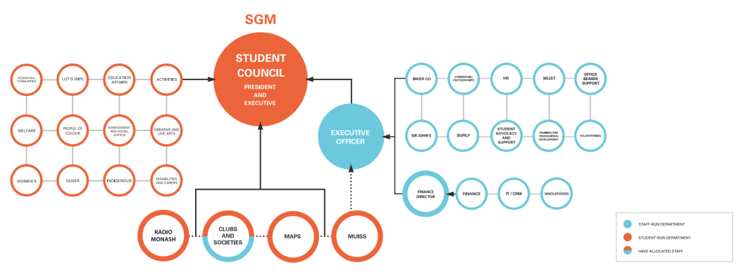 MSC是MSA的管理机构,由MSA执行委员会领导。MSA执行委员会由五名成员组成:主席、秘书和财务主管,均由学生会直接选举产生,MSA执行委员会负责起草MSA的年度预算,并负责与财务和员工聘用相关的其他一般事务。主席仅在MSC和MSA执行委员会出现票数相同的情况下拥有决定票。下图为MSA结构图,左侧橙色部分是本次主要竞选的职位。